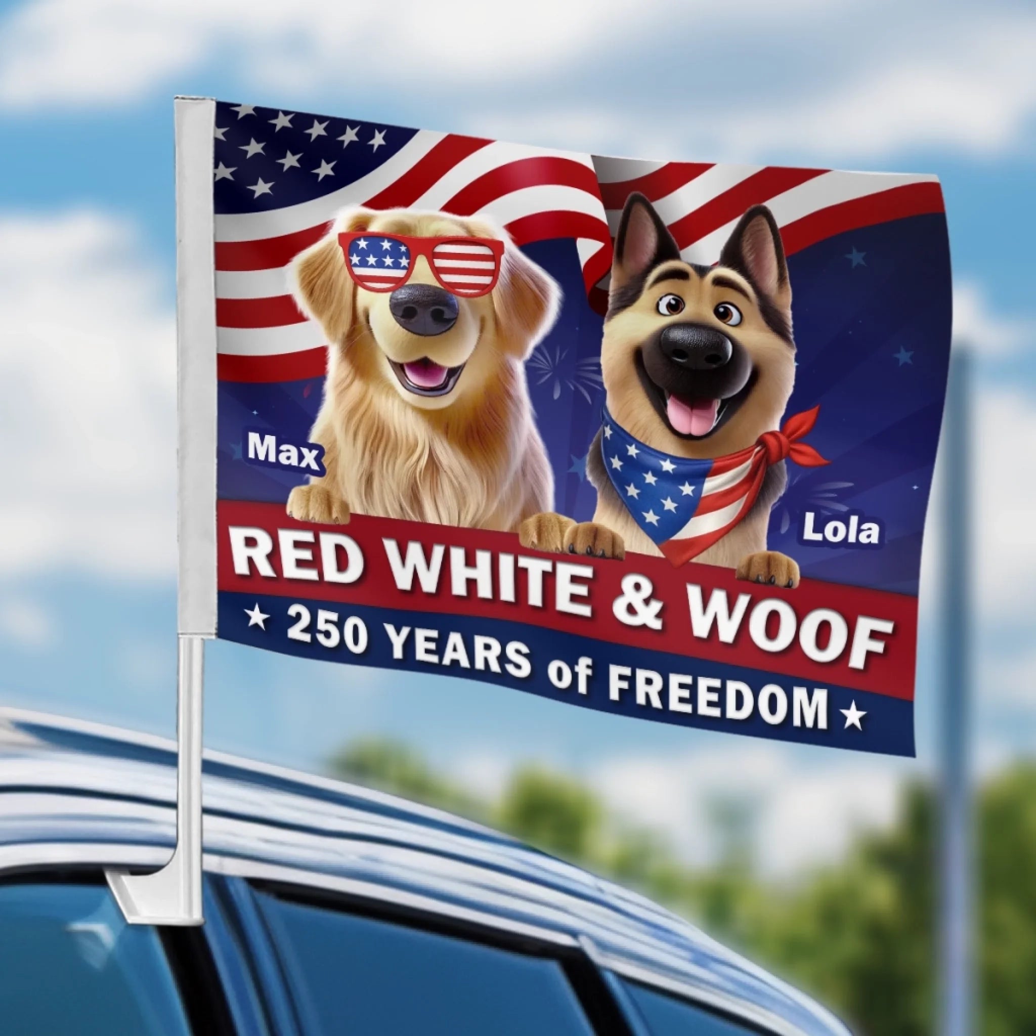 Custom Car Window Flag - Personalized America 250th Anniversary Gifts For Dog Lovers, Dog Dad And Mom - Rolling With Patriotic Pups